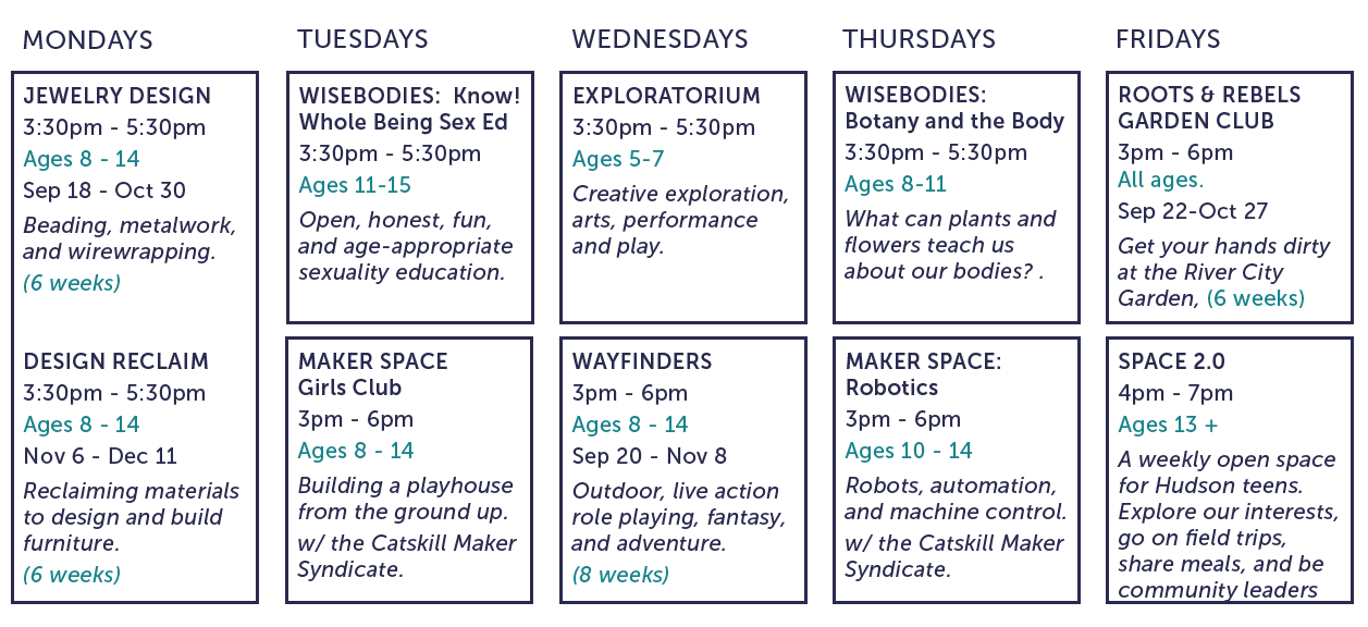 A weekly open space for Hudson teens. Explore your interests, go on field trips, share meals, be community leaders. Ages 13+