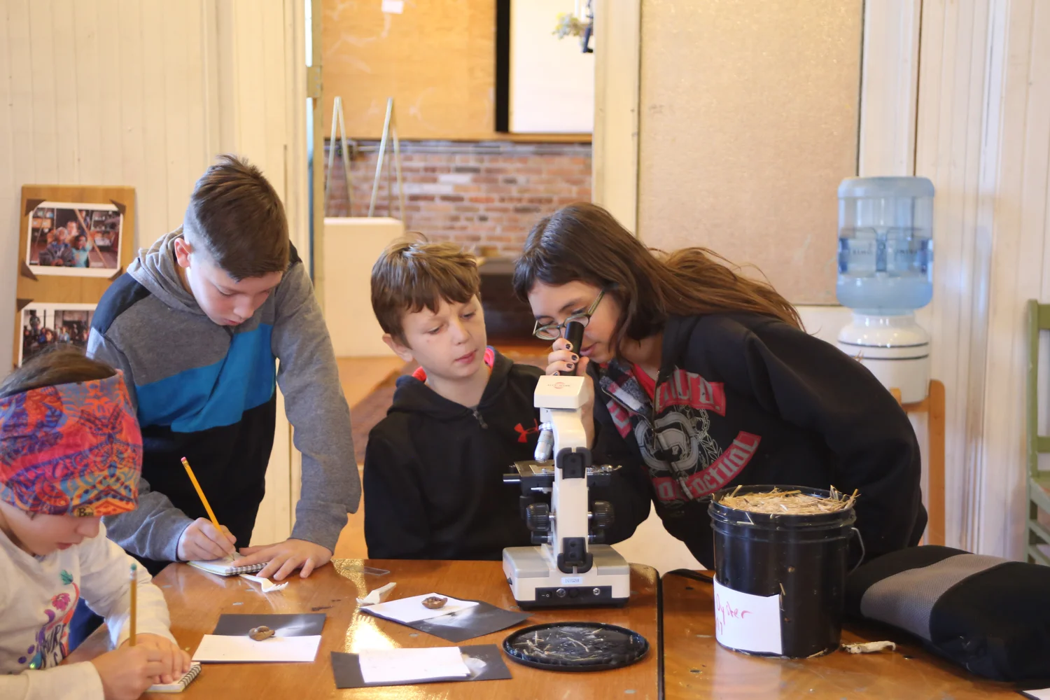 In this outdoor class, we experienced our environment as scientists and naturalists. We took field trips all over the region: from Cohotate Nature Preserve and North-South Lake to Hearty Roots Farm, Rock City Mushrooms and Art Omi. Along the way we learned to make observations, conduct experiments, and make connections between earth’s cycles: the life cycle, the water cycle, the seasonal cycle, and the nutrient cycle. We studies both forest ecosystems and farm ecosystems, watersheds and water cycles; we discovered the structures of fungi, and the geological layers of the earth. We developed new science vocabulary and formed our own scientific habits, while also performing skits, creating sculptures and paintings, and telling stories. Through a scary encounter with yellowjackets, we practiced not only noticing the scientific world around us, but taking care of each other as we do.