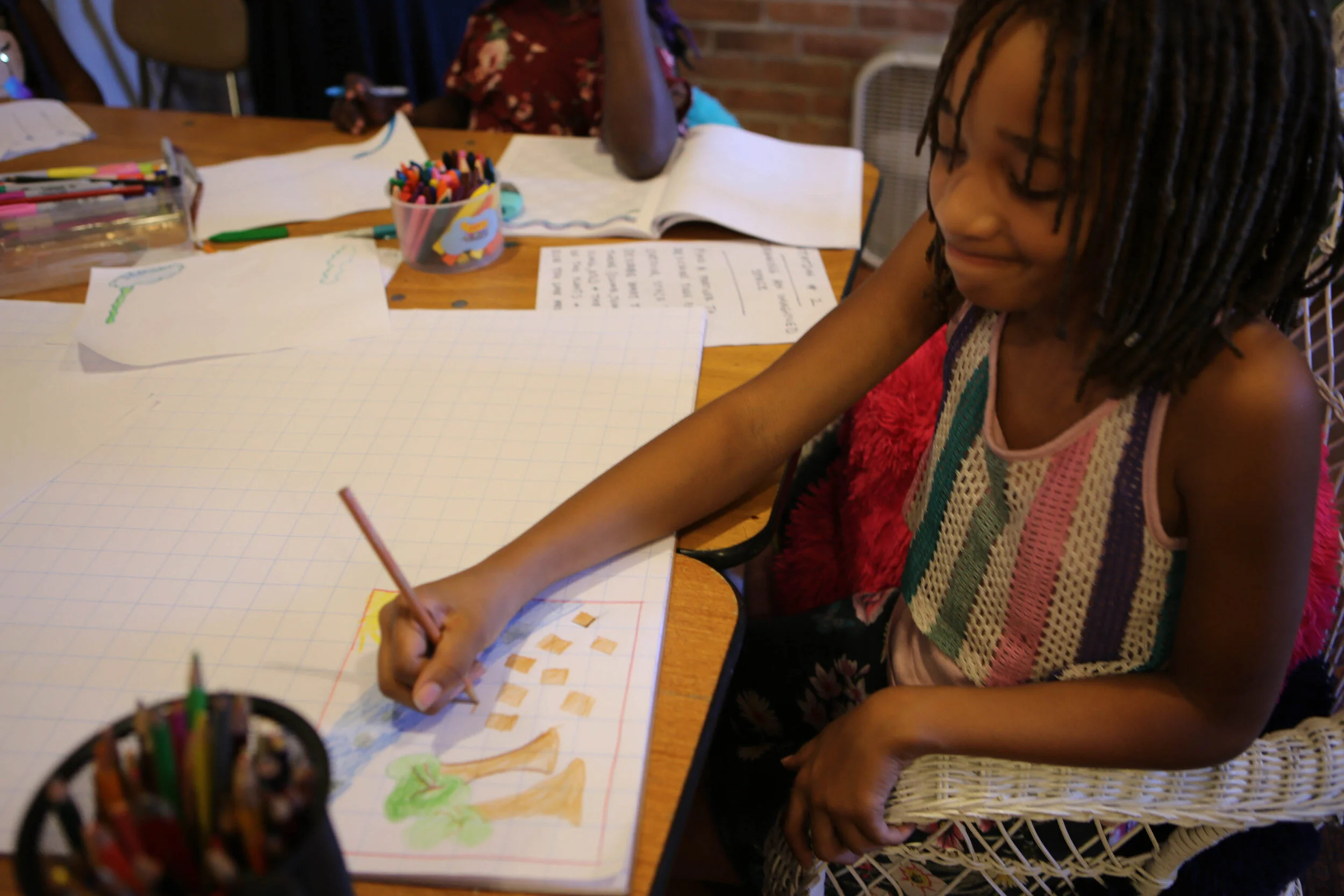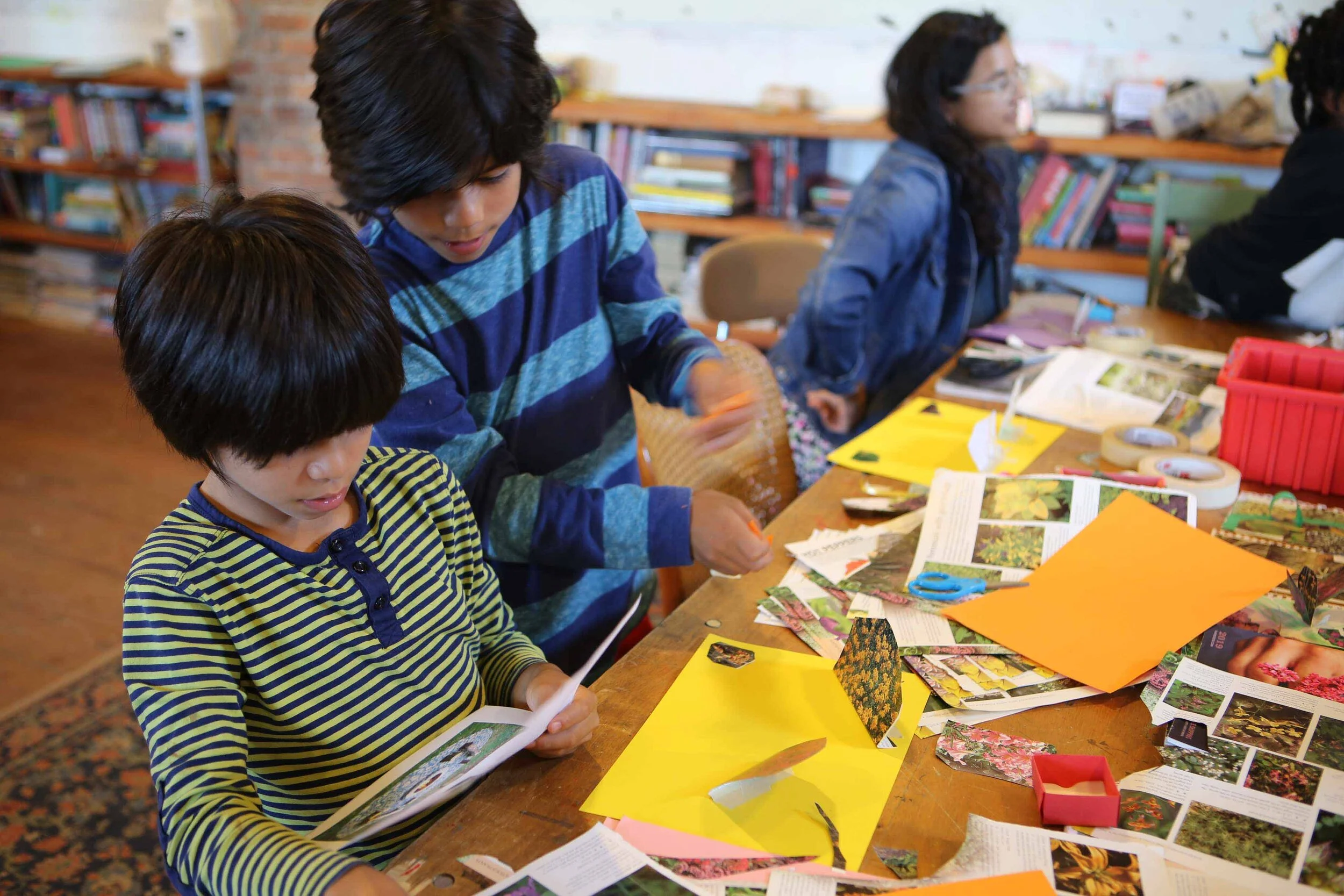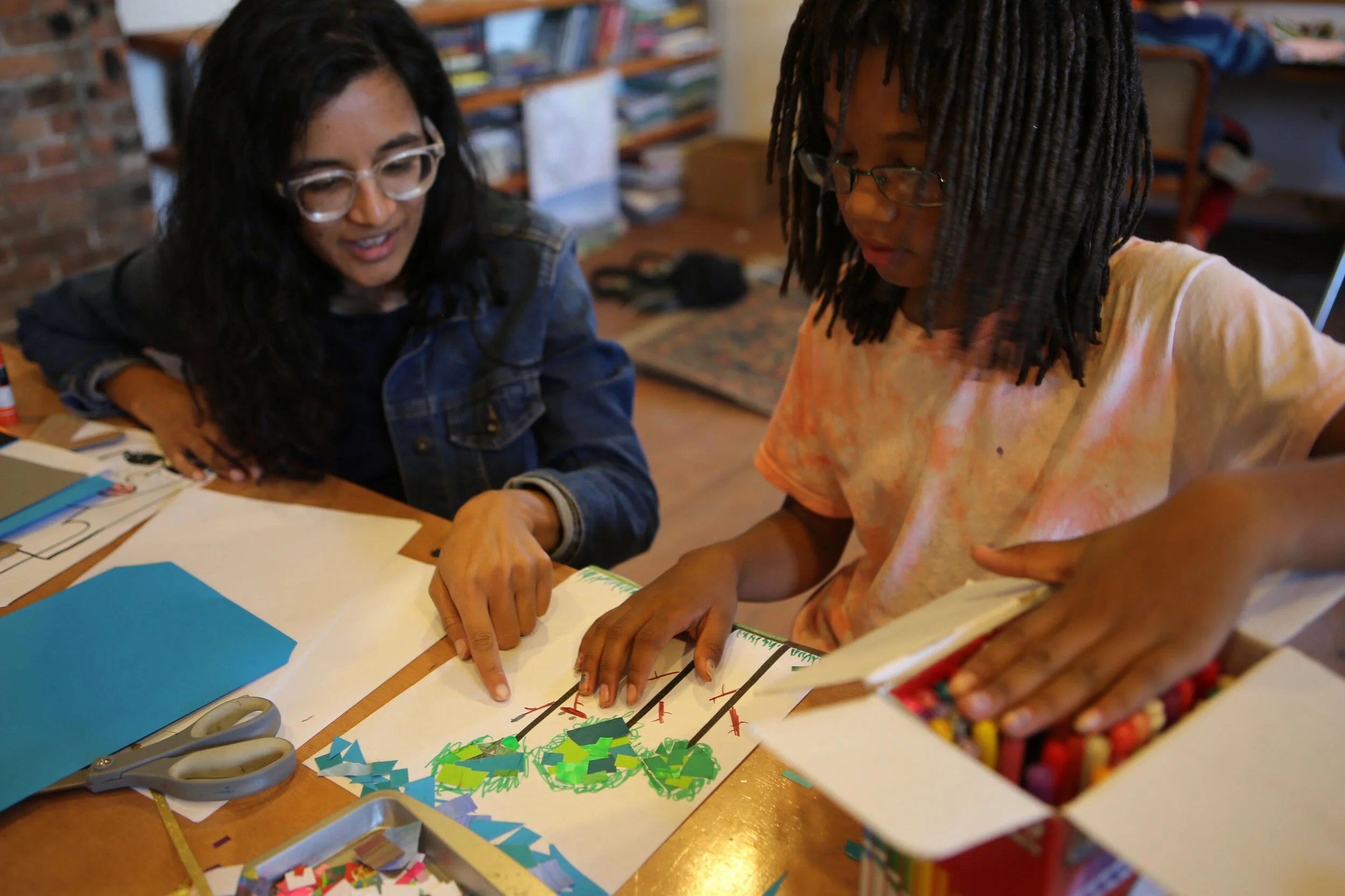 In this weekly creative movement and writing space, we told stories with our bodies, our voices, and our pens. Each week we played movement games -- practicing yoga poses, doing vocal exercises, closing our eyes to imagine worlds of characters, and acting out stories as they’re told. Together we watched and discussed different types of storytelling, including spoken word, music videos, animation, and shadow dance. We traveled to Mettabee Farm and Arts, where we learned the West African “Kuku” dance to live drumming. And we created our own written pieces: like a Book of Feelings to explore the worlds of our emotions, and ancient scrolls adorned with quotes and poems. We also discussed the “inner critic” inside each of us, brainstorming ways to combat it. At the end of class each week, we shared our works of art and our observations, recognizing and celebrating each others’ creations.