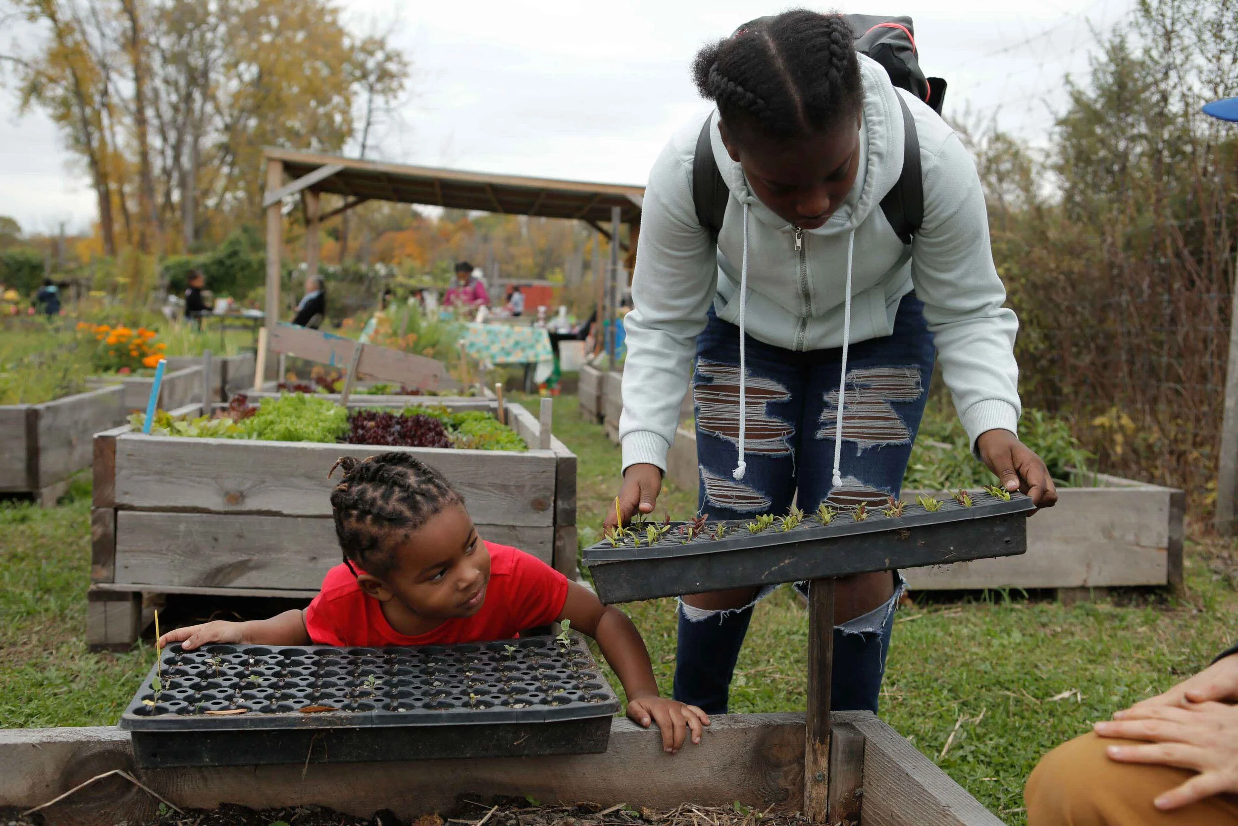 This semester, Roots & Rebels was bigger and better than ever, as we were joined each week by our friends from the Hudson Youth Department. We learned about insects by catching and examining them, and as usual, dug up lots of worms. We also built a bug hotel and painted stone bug buddies to adorn our new raised beds. We made our own garden fashion, constructing flower crowns, necklaces, and bracelets. Magic made an appearance at the garden too, as we made garden wands, fire cider, and scented potions using herbs and flowers from the garden. We also channeled the beauty of nature to make art: kids made art using old seeds, created leaf-inspired art, and crafted some paper mache pinatas. One of the most important aspects of garden club is creating a culture of friendship and togetherness, and we have found that this is usually achieved through food. Thanks to help from our teen staff, we harvested herbs and vegetables for snack time, including a new favorite: cucamelons! Kids collaborated to create weekly snacks -- fresh garden salsa, miniature grilled pizzas -- practicing their knife skills. As the days grew cold, we made piping pots of garden tea and had weekly campfires. On our final day of class, we had a huge community potluck party where we carved pumpkins, painted each others faces, bobbed for apples, and were even visited by a few spunky Nigerian Dwarf goats!