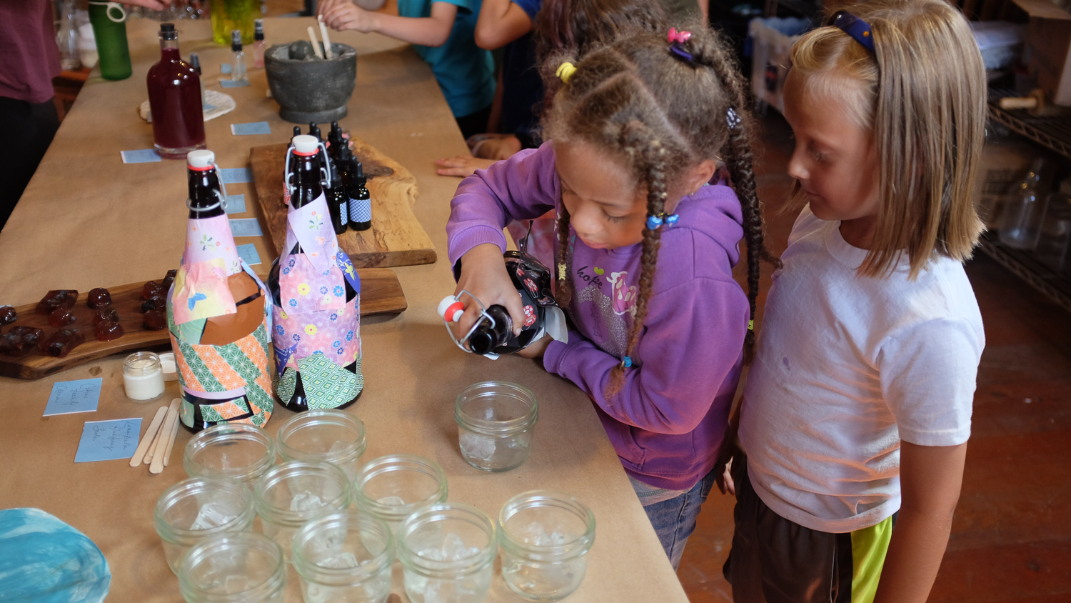We spent a week filled with activity and creation in our laboratory/apothecary, and out in the world exploring and harvesting in wild spaces and nearby farms. Through story and imaginative play we learned about the properties of plants, and had the opportunity to discover a love and awe for the special ways that they contribute to our wellness. Each day we engaged in gathering, processing and imbibing the seasonal bounty around us, getting ready to share it with others. We were hard at work transforming plant material into magic and medicine: making naturally fermented sodas, salves, tinctures, and natural dyes. Our week ended in an herbal wellness "clinic," run by children. Flying potions and elderberry syrup, soothing booboos and tummy aches, and caring for one another as a circle of friends.